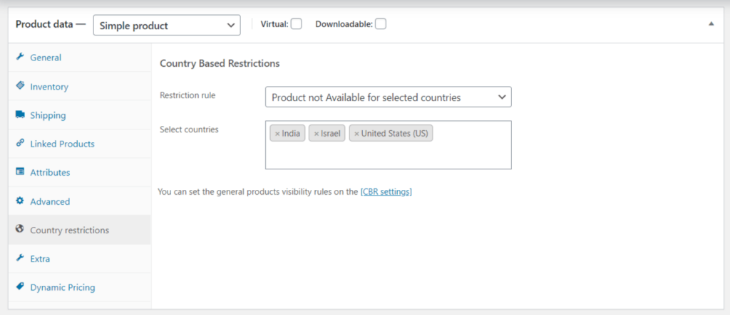 When editing a product, you can add restriction rules to products from the product data panel > Country Restrictions tab: