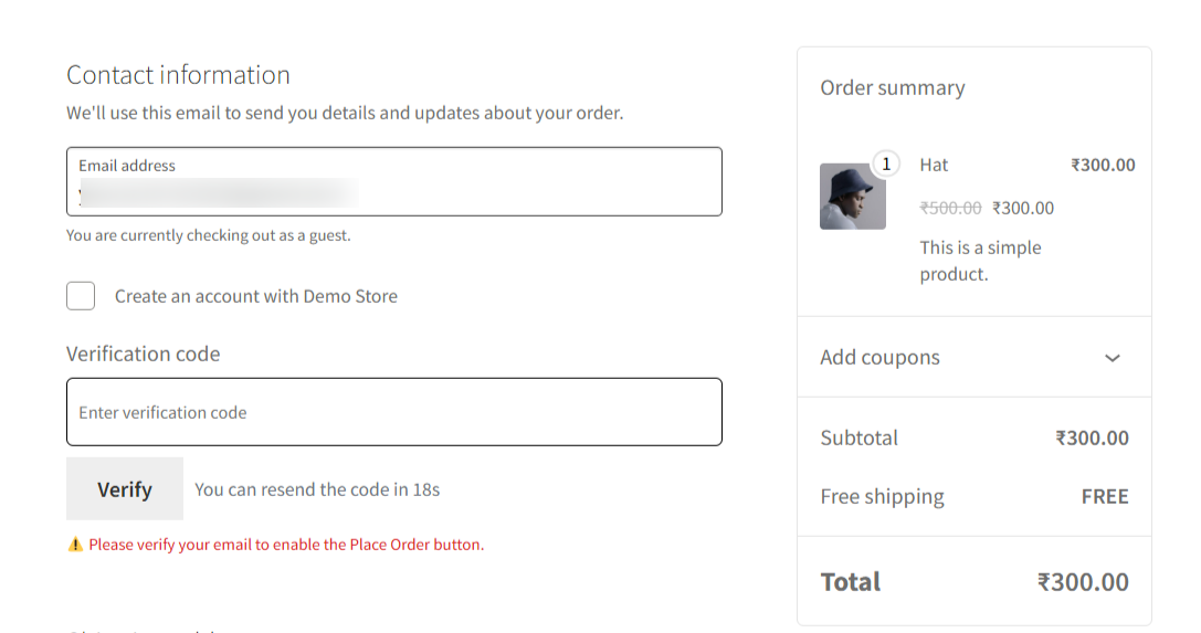 - Enable the Place order button (and remove the warning “Please verify your email to enable the Place Order button.”).
