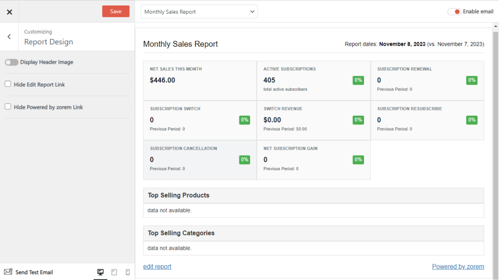 You can show/hide the Edit Report link and the Powered by Zorem link from the email report footer: