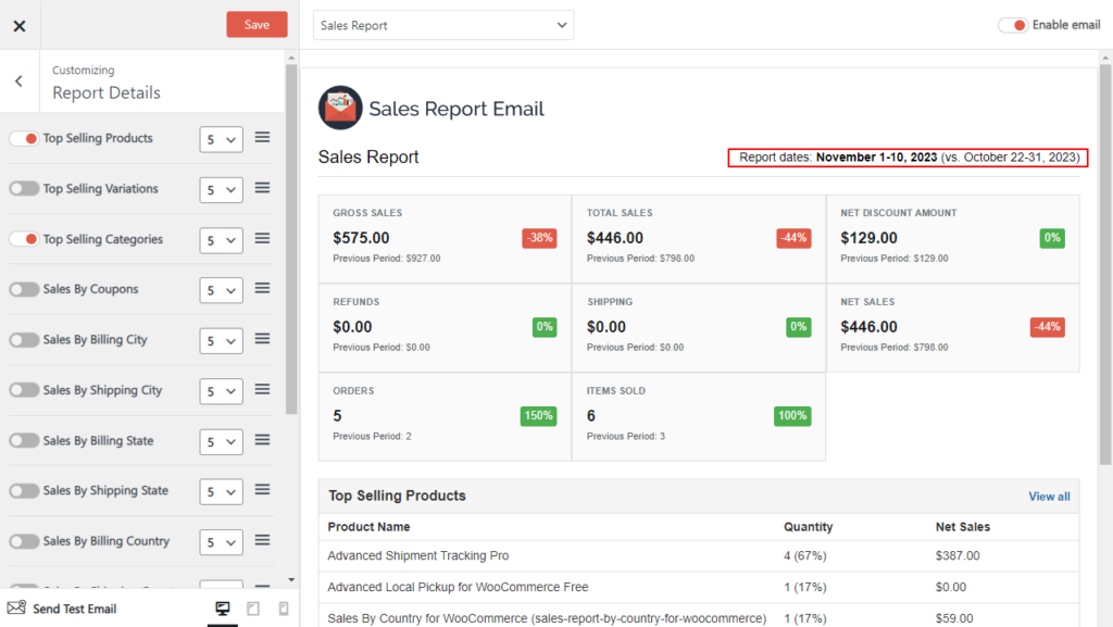 | Top Selling Products | Product name, Quantity, Total amount | 5,10,20, All |