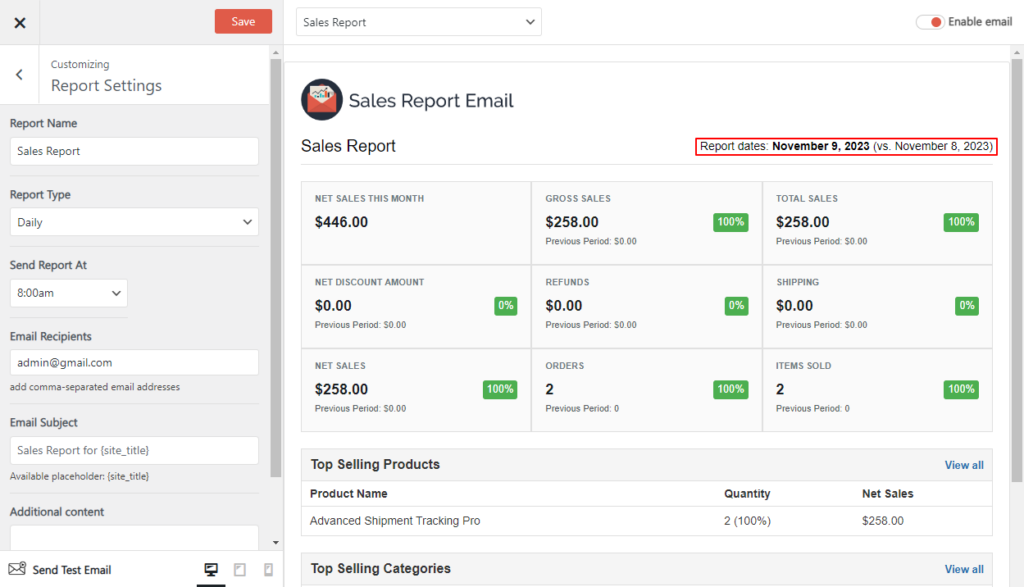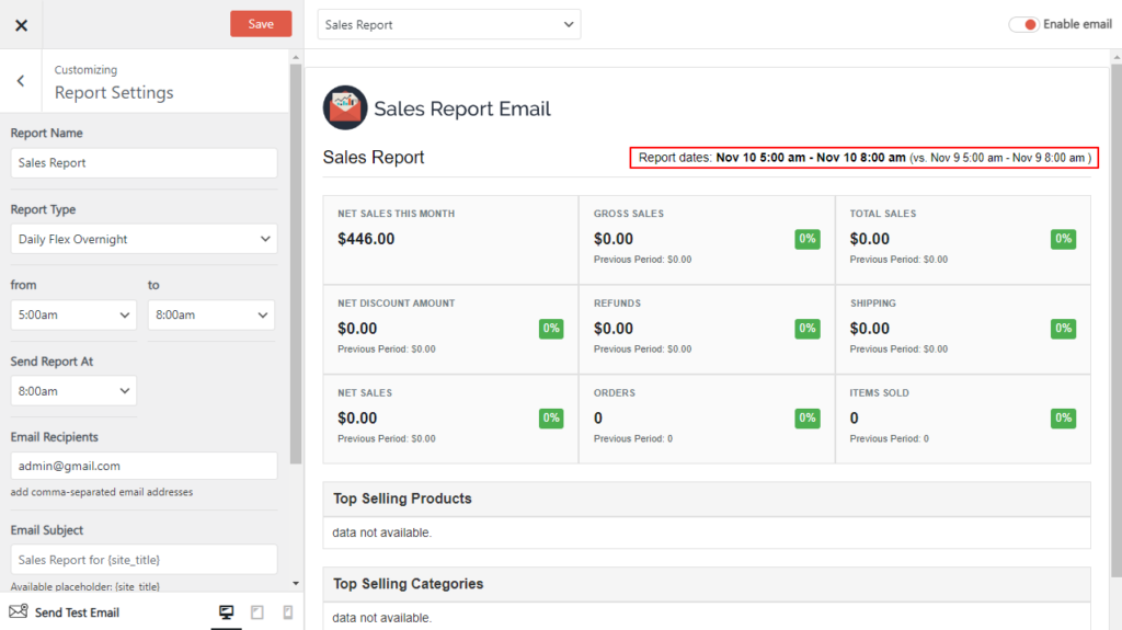 The Report Scheduler is a recurring and automated interface to automatically email you sales reports from your WooCommerce store on a periodic basis. You can schedule to send email reports by the following options