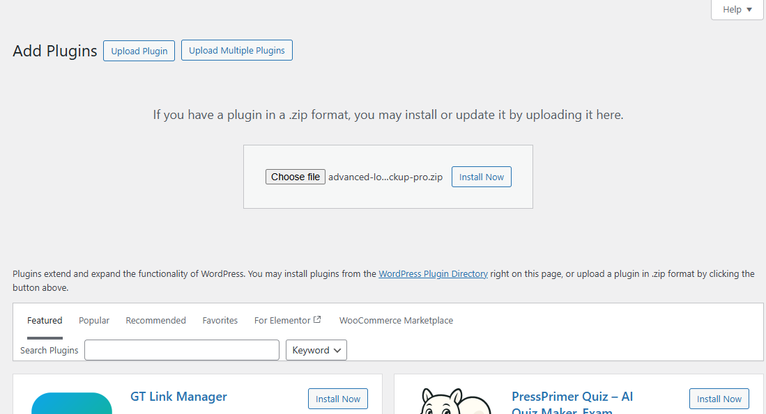 WordPress Admin → Plugins → Add New → Upload Plugin