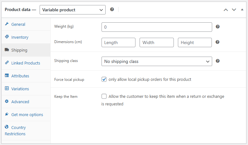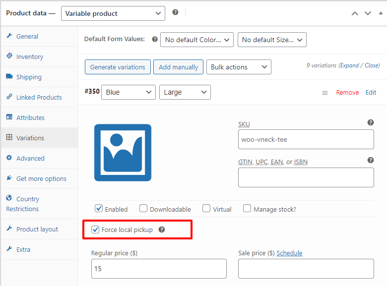 - Enable the Force Local Pickup setting to make this variation available exclusively for local pickup.