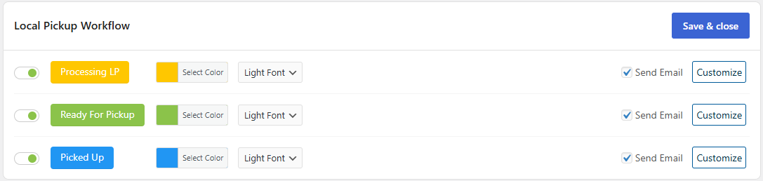 The Local Pickup Workflow involves three custom order statuses to streamline the in-store pickup process: